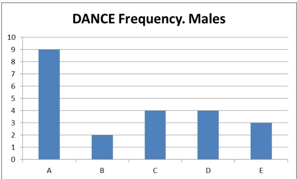 c) The percentage of the favorite dance (A) is 4.5 times more than the least favorite dance (B) for males.
