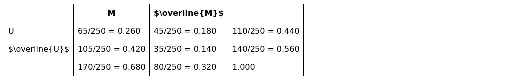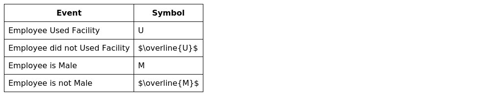 A company has made available to his employees (without charges) extensive club facilities that may be used before work, during the lunch hour, after work and on weekend. The record for the last year indicates that of 250 employees, 110 used the facilities at sometimes. Of 170 males employed by a company, 65 used the facilities. What is the probability that an employer chooses at random (setup contingency table)