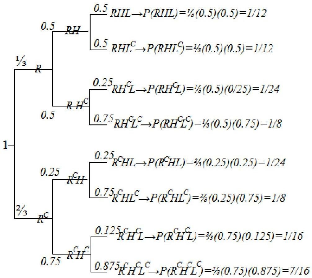 Each leaf in the tree corresponds to a single outcome in the sample space. We can calculate the probabilities of each outcome in the sample space by multiplying the probabilities on the edges of the tree that lead to the corresponding outcome.