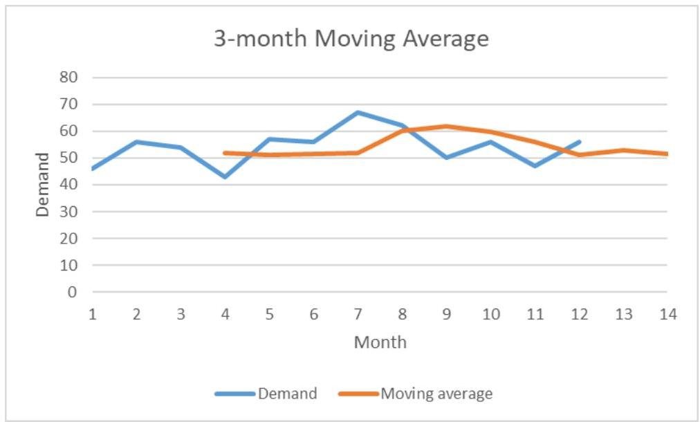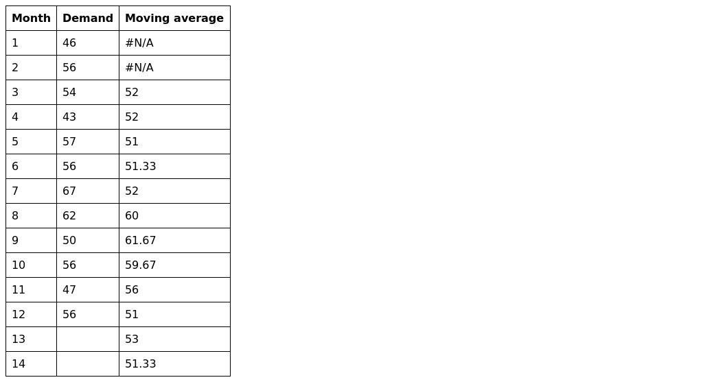Plot the following data about demand for an item. Find the moving averages by taking . Use these to forecast next two months' demand.
