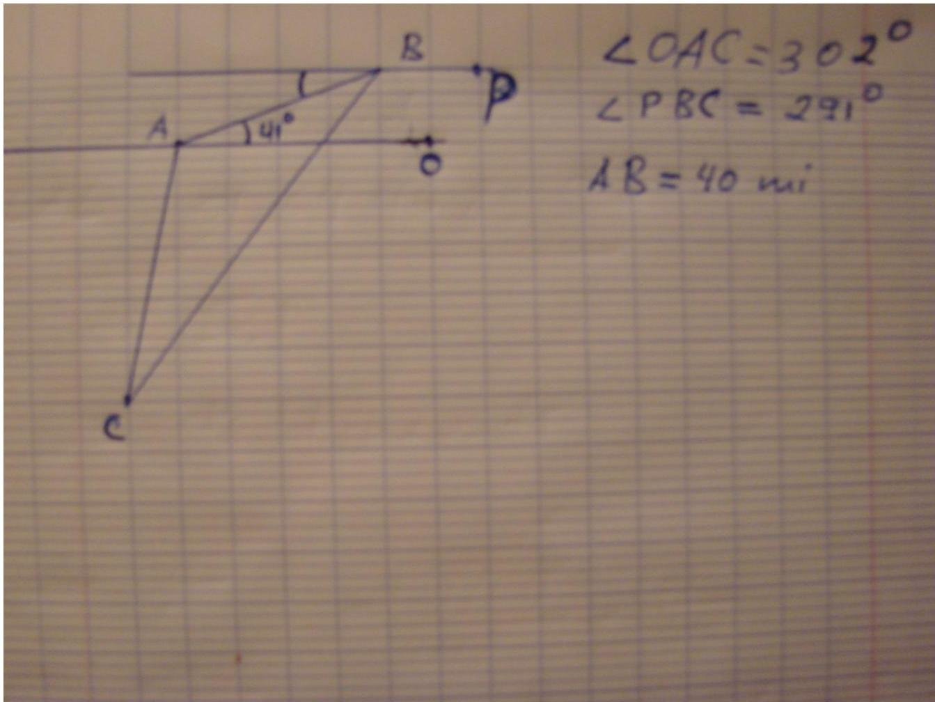 sin(<ACB)AB=sin(<ABC)AC→AC=ABsin(<ACB)sin(<ABC)=196.99misin(<ACB)AB=sin(<CAB)BC→BC=ABsin(<ACB)sin(<CAB)=207.05miANSWER!!!!!!!!!!!!!!!!!!!!!