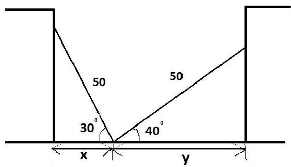A ladder with its foot in the street makes an angle of 30 degrees with the street when its top rests on a building on one side of the street and makes an angle of 40 degrees with the street when its to rests on a building on the other side of the street. If the ladder is 50 feet long, how wide is the street?