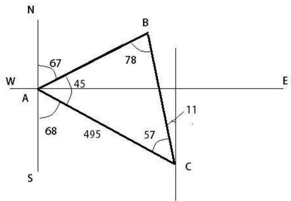 House B is located at a bearing of N67°E from house A. House C is 495 meters from house A at a bearing of S68°E. House B is located at a bearing of N11°W from house C. Find the distance from house A to house B.