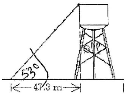 Suppose you have been to measure the height of the local water tower. Climbing makes you dizzy, so you decide to do the whole job level. From a point 47.3 meters from the base of the tower, you find that you must look up at an angle of 53 degrees to see the tower. How tall is the tower? Draw the triangle.