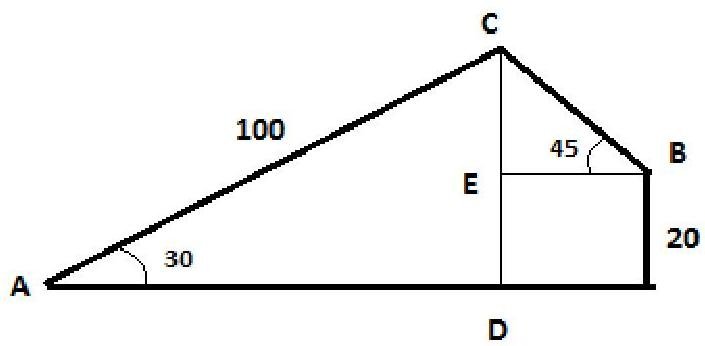 A boy standing on a horizontal plane finds a bird flying at a distance of 100m from him at an elevation of 30 degree. a girl on the roof of 20 m high building finds the angle of elevation of the same bird to be 45 degree. both the girl and the boy are on the opposite sides of the bird. find the distance of the bird from the girl
