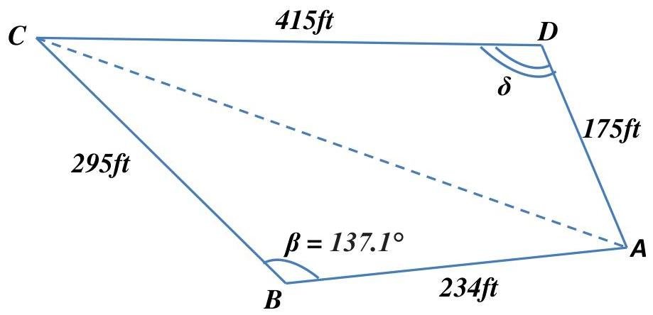 A parcel of land has sides measuring 175ft, 234ft, 295ft and 415ft and the angle between the sides of the length 234ft and 295ft has measure 137.1∘ what is the measure of the opposite this angle?