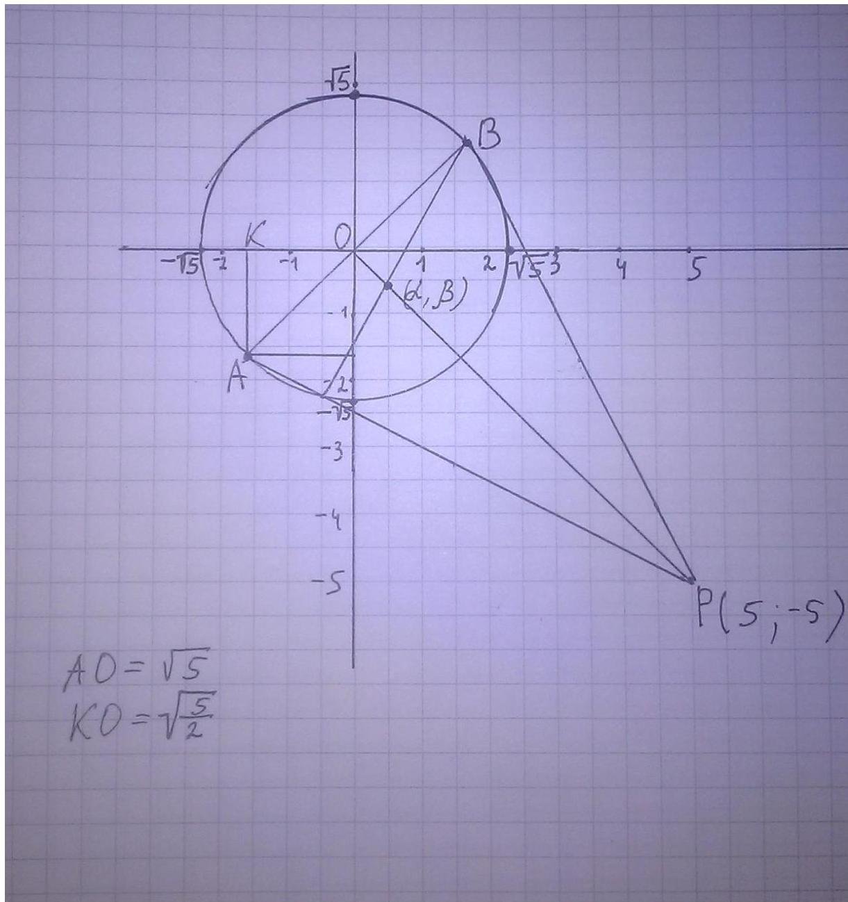 1. If A B AB A B is a chord of contact of point P ( 5 , − 5 ) P(5, -5) P ( 5 , − 5 ) to the circle x 2 + y 2 = 5 x^2 + y^2 = 5 x 2 + y 2 = 5 and ( α , β ) (\alpha, \beta) ( α , β ) is the orthocenter of Δ P A B \Delta PAB Δ P A B , then ∣ α − 1 ∣ + ∣ β − 1 ∣ |\alpha - 1| + |\beta - 1| ∣ α − 1∣ + ∣ β − 1∣ is equal to