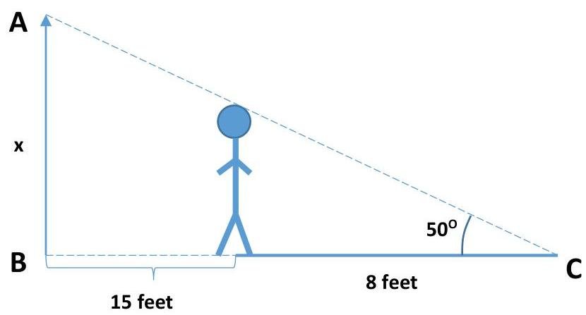 x=tan50∘×23 (feet)≈1.19×23 (feet)=27.37 (feet)≈27 (feet)Answer: 27 feet.