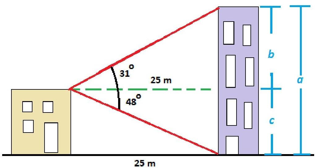 Two buildings are 25m apart. From the top of the shorter building, the angles of elevation and depression of the top and bottom of the taller building are 31∘ and 48∘ respectively. What is the height of the taller building? Give your answer to the nearest meter.