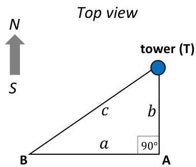 Let h be the height of tower, ∣AT∣=b, ∣BT∣=c.
