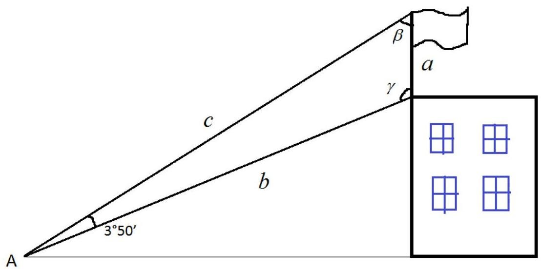 A flagpole 25 ft high, standing on the edge of the roof of a high building, when seen from a point A on the ground subtends an angle of 3∘50′. If A is 200 ft from the bottom of the pole, how far is it from the top?