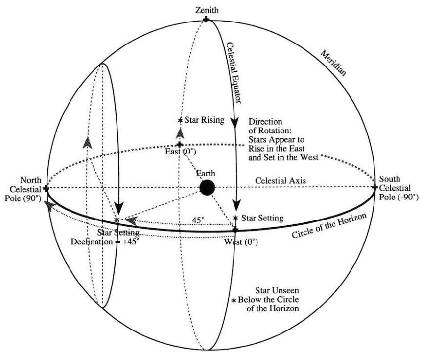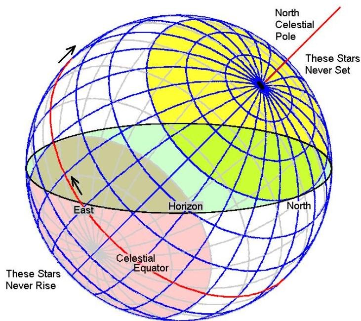The celestial sphere is an imaginary sphere of gigantic radius with the earth located at its center. The poles of the celestial sphere are aligned with the poles of the Earth. The celestial equator lies along the celestial sphere in the same plane that includes the Earth's equator. An astronomer can only see half the sky at a time, that is, only half the sky is above the horizon at any time. But the sky keeps moving as the earth rotates. Just as the sun rises and sets every day, so does every star in the sky each night. The celestial sphere is a large sphere surrounding the earth and with it we can keep references to where celestial bodies lie in the sky.