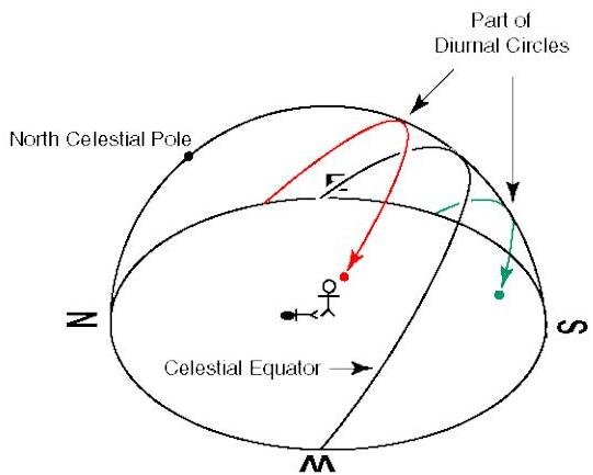 As Earth spins daily on its axis, the stars appear to rotate in circular paths around one of the celestial poles (the north celestial pole for observers in the northern hemisphere, or the south celestial pole for observers in the southern hemisphere). Stars far from a celestial pole appear to rotate in large circles; stars located very close to a celestial pole rotate in small circles and hence hardly seem to engage in any diurnal motion at all. Depending on the observer's latitude on Earth, some stars — the circumpolar ones — are close enough to the celestial pole to remain continuously above the horizon, while other stars dip below the horizon for some portion of their daily circular path (and others remain permanently below the horizon).