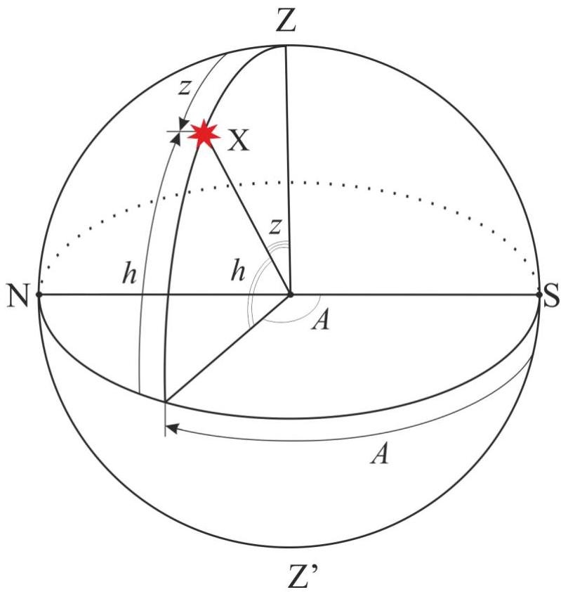 Show the horizon coordinates of a star X on a celestial sphere for a location at latitude 30∘ N.
