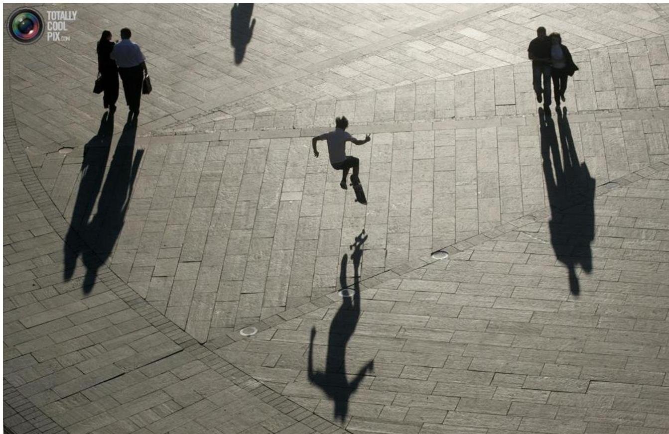 The shadow represents a zone where photons (as light waves) emanating from a source are blocked by impeding matter. It is the pattern formed when light is blocked by an object and peripheral light to the sides of the object strikes the surface.