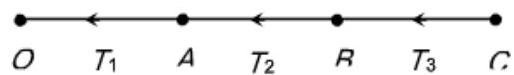 Three identical particles are joined together by a thread as shown in the figure. All the three particles are moving on a smooth surface horizontal plane about point O. If the speed of the outermost particle is V, then the ratio of tensions in the three sections of the string is: (Assume that the string remains straight)