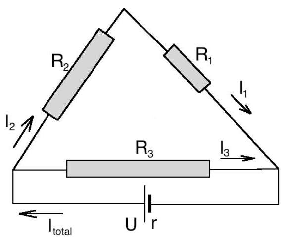 a uniform wire of resistance 15ohms is cut into three pieces in ratio 1:2:3 and the three pieces are connected to form a triangle. a cell of 10V potential with internal resistance 1ohm is connected across the highest of three resistors. calculate the current through each part of the circuit.