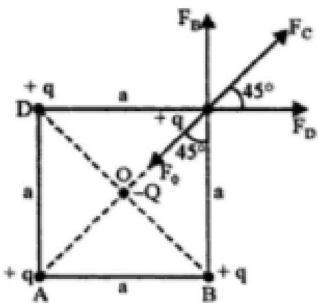 F D + ( F A − F C ) cos 45 = F sin 45 F_{D} + (F_{A} - F_{C}) \cos 45 = F \sin 45 F D + ( F A − F C ) cos 45 = F sin 45 F B + ( F A − F C ) sin 45 = F cos 45 F_{B} + (F_{A} - F_{C}) \sin 45 = F \cos 45 F B + ( F A − F C ) sin 45 = F cos 45 F = 0 F = 0 F = 0 k q 2 a 2 + ( k q 2 ( 2 a ) 2 − k Q q ( 2 2 a ) 2 ) 2 2 = 0 \frac{k q^{2}}{a^{2}} + \left(\frac{k q^{2}}{\left(\sqrt{2} a\right)^{2}} - \frac{k Q q}{\left(\frac{\sqrt{2}}{2} a\right)^{2}}\right) \frac{\sqrt{2}}{2} = 0 a 2 k q 2 + ⎝ ⎛ ( 2 a ) 2 k q 2 − ( 2 2 a ) 2 k Qq ⎠ ⎞ 2 2 = 0 k q 2 a 2 + ( k q 2 2 a 2 − k Q q a 2 2 ) 2 2 = 0 \frac{k q^{2}}{a^{2}} + \left(\frac{k q^{2}}{2 a^{2}} - \frac{k Q q}{\frac{a^{2}}{2}}\right) \frac{\sqrt{2}}{2} = 0 a 2 k q 2 + ( 2 a 2 k q 2 − 2 a 2 k Qq ) 2 2 = 0 q + ( q 2 − 2 Q ) 2 2 = 0 q + \left(\frac{q}{2} - 2 Q\right) \frac{\sqrt{2}}{2} = 0 q + ( 2 q − 2 Q ) 2 2 = 0 Q = q 4 ( 1 + 2 2 ) Q = \frac{q}{4} \left(1 + 2 \sqrt{2}\right) Q = 4 q ( 1 + 2 2 )