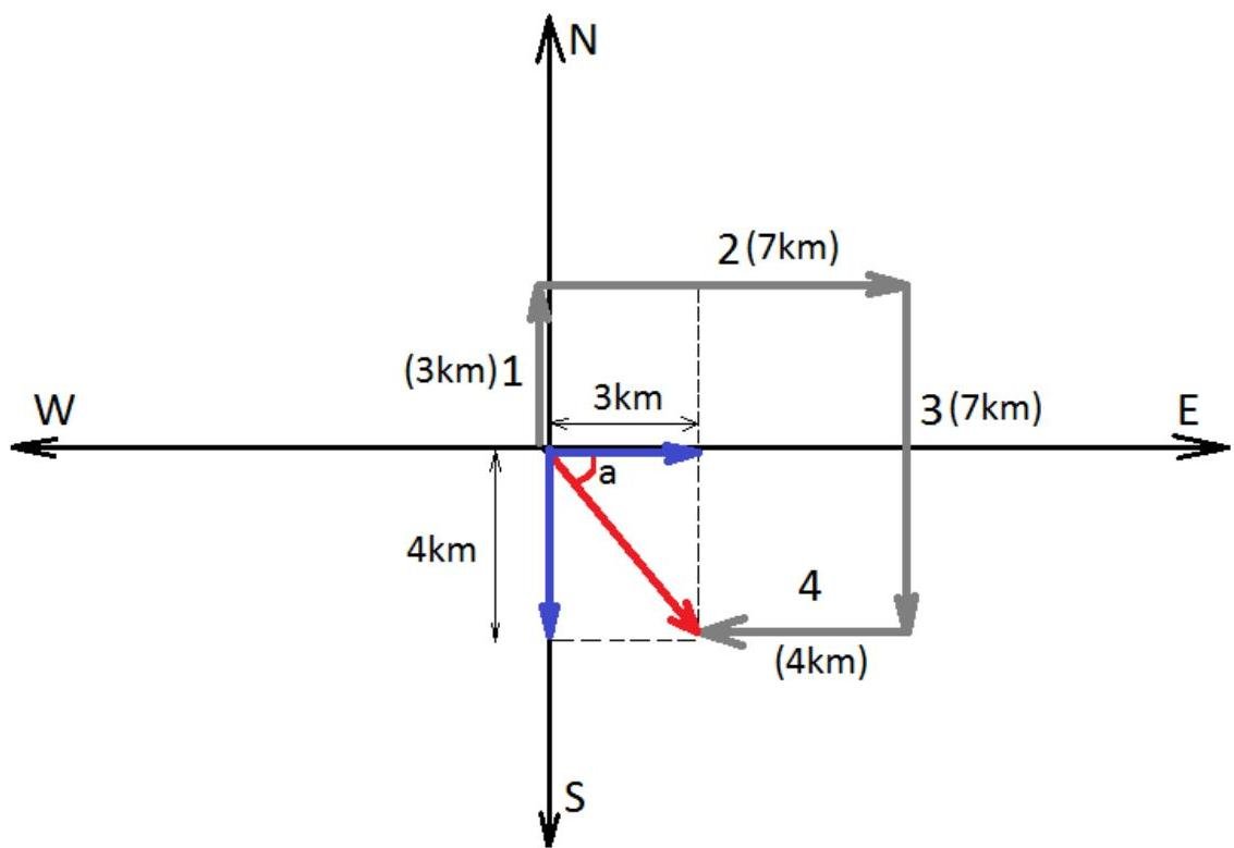 Horizontal: man wandered 7 km east and 4 km west, therefore he wandered 7 - 4 = 3 km east.