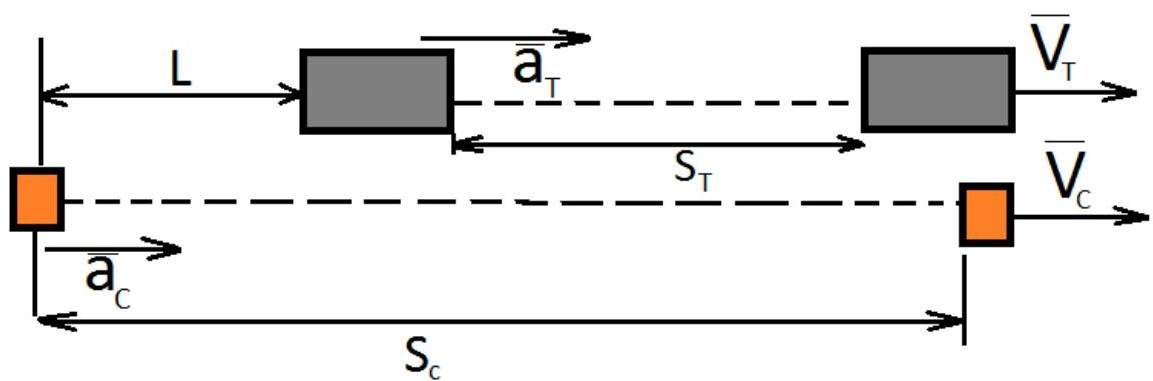 A car and a truck start from rest at the same instant, with the car initially at some distance behind the truck. The truck has a constant acceleration of 2.10m/s2 , and the car an acceleration of 3.31m/s2 . The car overtakes the truck after the truck has moved a distance 49.0m .
