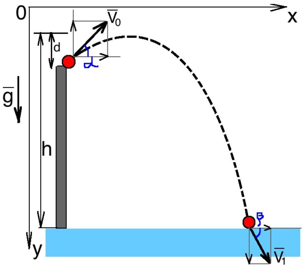 A diver springs upward from a board that is 4.50m above the water. At the instant she contacts the water her speed is 15.4m/s and her body makes an angle of 66.0∘ with respect to the horizontal surface of the water. Determine her initial velocity, both (a) magnitude and (b) direction.