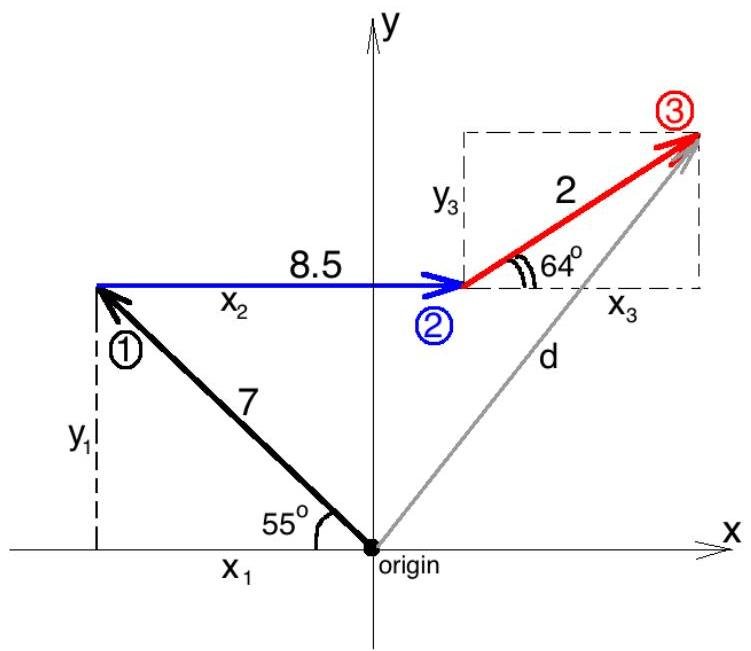 1. x and y displacement for the first part of the movement (from the right triangle):
