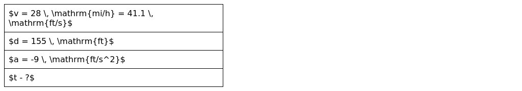 1. A ranger in a national park is driving at when a deer jumps into the road 155 ft ahead of the vehicle. After a reaction time , the ranger applies the brakes to produce an acceleration of . What is the maximum reaction time allowed if she is to avoid hitting the deer?