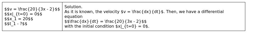 \end{array} d t d x = 3 x − 2 20 , ( 3 x − 2 ) d x = 20 d t , ∫ 0 2 ( 3 x − 2 ) d x = ∫ 0 t 20 d t , ( 2 3 x 2 − 2 x ) ∣ ∣ 0 x = 20 t ∣ ∣ 0 x , 2 3 x 2 − 2 x = 20 t .