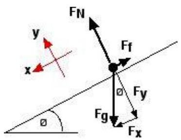 Here is the force in the direction, is the force in the direction, is the force of gravity, is the normal force and is the force of friction. Finally, is the angle of the slope (in our case, ).