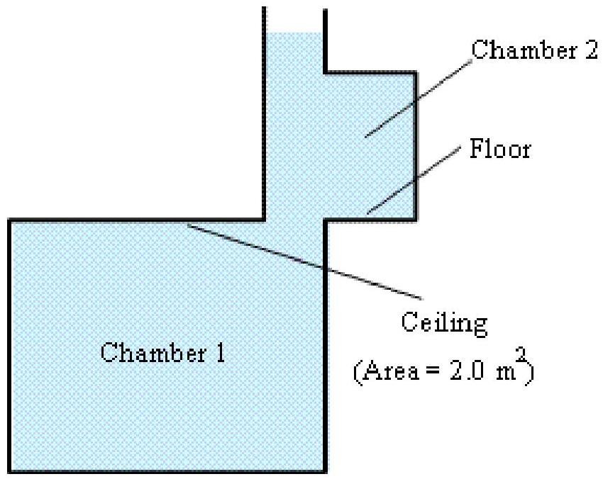 Two chambers are filled with a fluid. The ceiling of chamber 1 is at the same level as the floor of chamber 2. The pressure at the floor of chamber 2 is 1.7×105 Pa. If the area of the ceiling of chamber 1 is 2.0 m2, what is the magnitude F of the force exerted by the fluid on the ceiling of chamber 1?