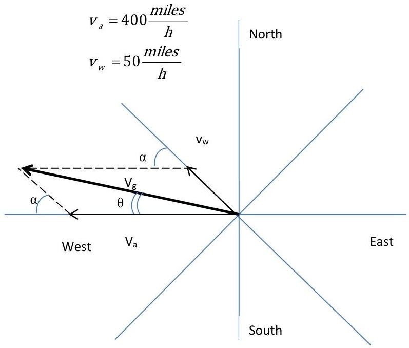 The angle between west and northwest directions is α=45∘. From hence, according the cosine theorem of triangle the ground speed of airplane is