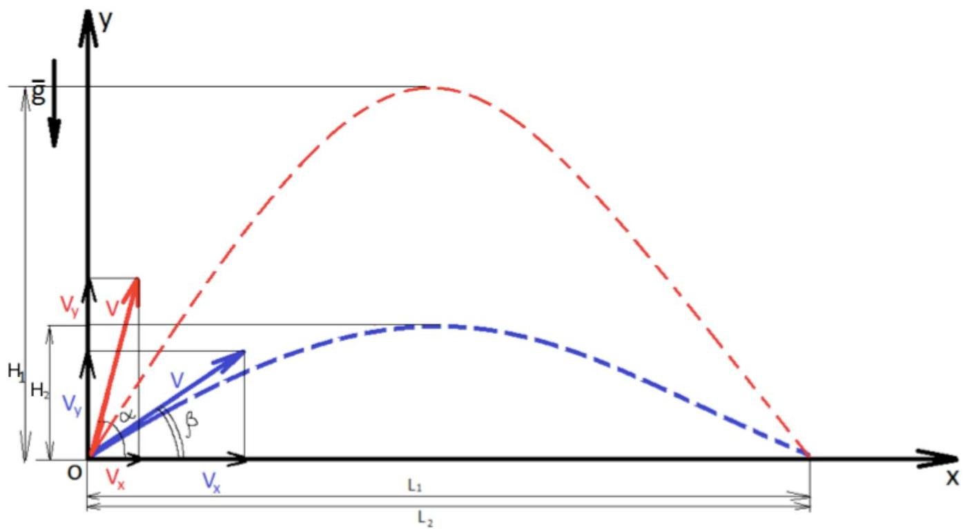 Vx=Vcosα;Vy=Vsinα;x:L1=VT1cosα(1),T1−time of the flighty:0=VT1sinα−2gT12Vsinα=2gT1T1=g2Vsinα(2)(2)in(1):L1=Vg2Vsinαcosα=g2V2sinαcosα