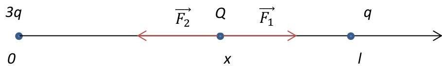 The third charge is interacting with first and second ones with forces and , where is the position of the charge . These forces have opposite directions. The total force acting on the third chart is