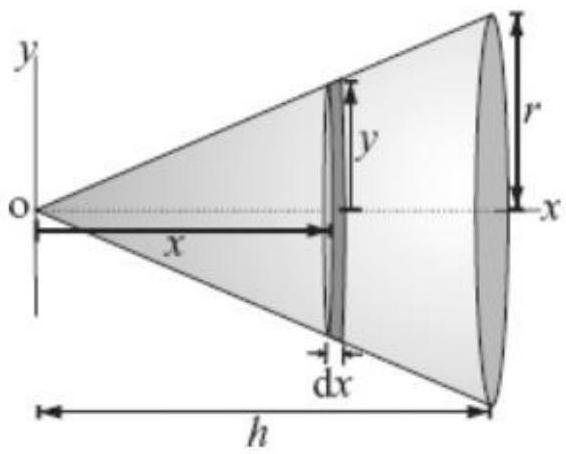Take the apex of the cone shown in Figure as the origin. The cone is symmetric about x -axis, therefore y -coordinate of centre of gravity is given yc=0 .