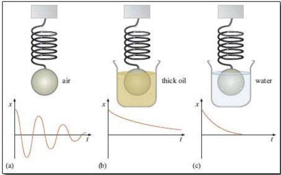 Figure: Plots of displacement vs time for the mass-spring system: (a) underdamped – mass in air; (b) overdamped – mass in thick oil; (c) critically damped – mass in water