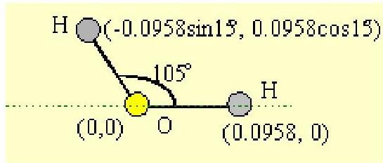 a) The distance between the oxygen molecule and each of the hydrogen atoms in a water (H2O) molecule is 0.96 Å and the angle between the two oxygen-hydrogen bonds is 105∘ . Treating the atoms as particles, find the centre of mass of the system.