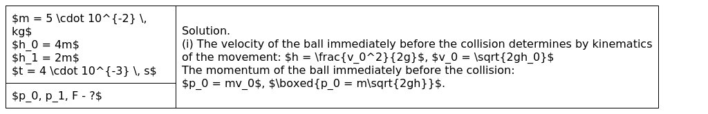 1. A ball of mass kg, 5.0∗10∧−2 starting from rest, falls a height of 4.0m and then collides with the ground. The ball bounces up to a height of 2.0m. The collision with the ground takes place over a time 4∗10∧−3 s. Determine (i) the momentum of the ball immediately before the collision, (ii) the momentum of the ball immediately after the collision and (iii) the average force of the ground on the ball.