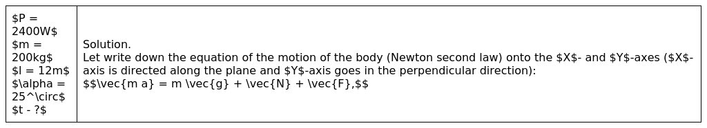 1. A 2400 W engine pulls a 200 kg block at constant speed up a 12.0 m long, 25.0° incline. Determine long does it takes to cover this distance.