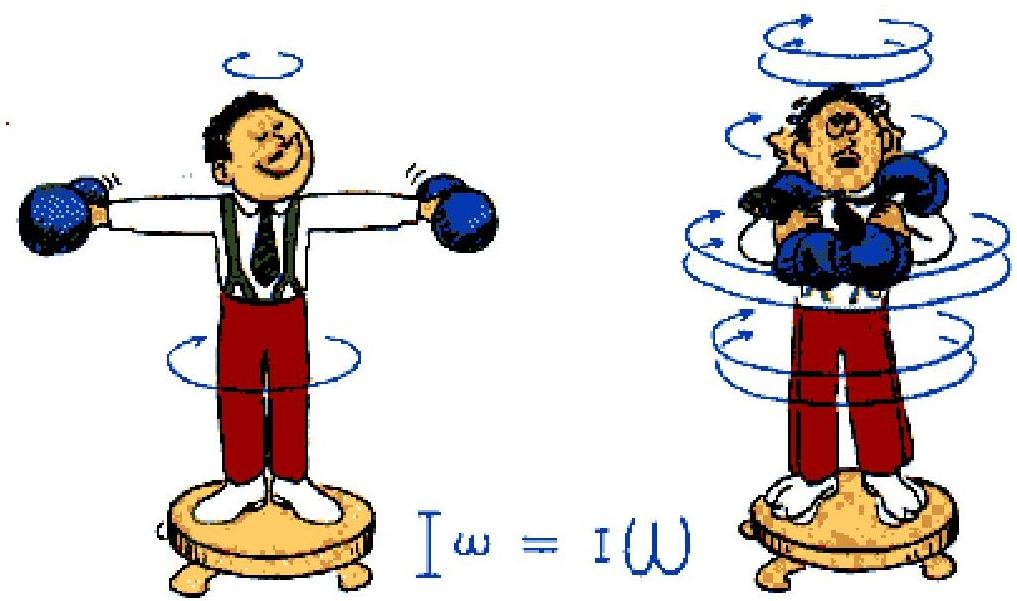 It is more fun to watch this executed by a high diver or a figure skater. But you can demonstrate the same ideas yourself on a rotating chair with a couple of heavy books in your hands. Or, we have also demonstrated this in class with a nice turntable and weights,
