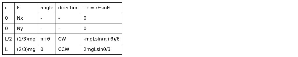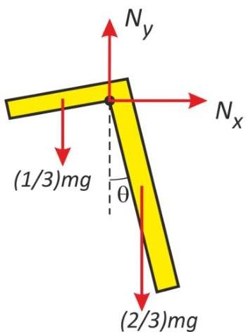 The forces that we know are working on the L-shaped object are a normal from the nail and the weight which acts from the center of mass. Ordinarily, for complex shapes, we first determine the CM. However, in this case, it is easier to consider the two arms of the objects as being separate objects. The long arm will have a mass and the short arm will be .