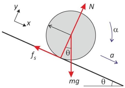 The cylinder is said to roll without slipping. That phrase means that the angular acceleration of the ball about its CM is related to its linear acceleration by .