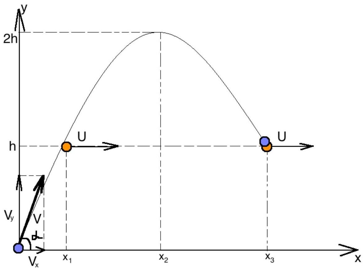 These problems can be rather tricky with the number of equations that can be written down. If you draw the parabolic arc representing the path of the stone, this path must pass through the top of the pole (let its coordinates there be (x1,h) with h= height of the pole) then to the top of its flight with coordinates (x2,2h) and then to the point where it brushes the bird at coordinates (x3,h) . Then we note that if t1,t2,t3 are the times for the stone to reach x1,x2,x3 respectively, then t3 is also the time for the bird to travel a distance (x3−x1) at speed U , that is U⋅t3=x3−x1 and this is the equation I shall be using to find the horizontal velocity of the stone.