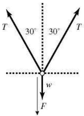 A 6 kg box is held at rest by two ropes that form angles with the vertical. An external force F acts vertically downward on the box. The force exerted by each of the two ropes is denoted by T. A force diagram, showing the four forces that act on the box in equilibrium, is shown in the figure. The magnitude of force F is 410 N. What is the magnitude of force T?