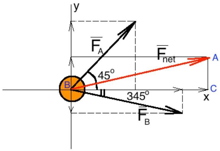 Two people, A and B are pulling on a tree with ropes while person C is cutting the tree down. Person A applies a force of 80.0 N [45.0°] on one rope. Person B applies a force of 90.0 N [345°] on the other rope. Calculate the net force on the tree?