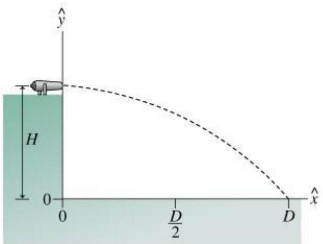 A cannon is placed on the edge of a cliff that is 300 m tall. The barrel of the cannon is parallel to the ground below. If a cannonball leaves the barrel in a horizontal direction with a velocity of 115 m/sec how far out from the base of the cliff will the cannonball land?