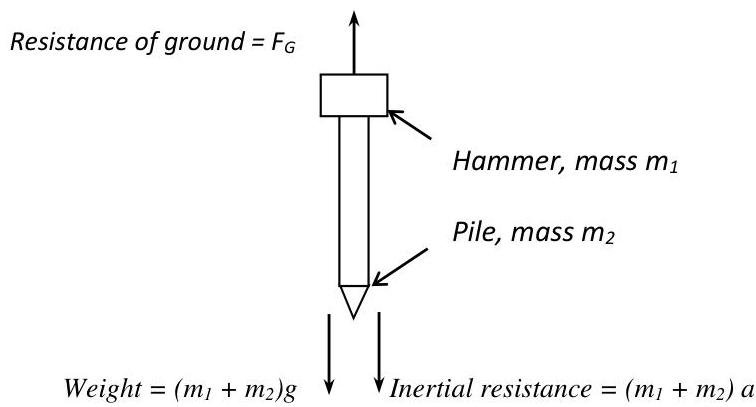 A piledriver hammer of mass 150kg falls freely through a distance of 5m to strike a pile of mass 400kg and drives it 75mm into the ground. The hammer does not rebound when driving the pile. Determine the average resistance of the ground.