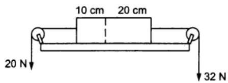 A uniform rod of length having a mass of . The strings are pulled by constant forces of and . Find the force exerted by part of the rod on the part. All the surfaces are smooth and the strings and pulleys are light. Force of acts on part and on