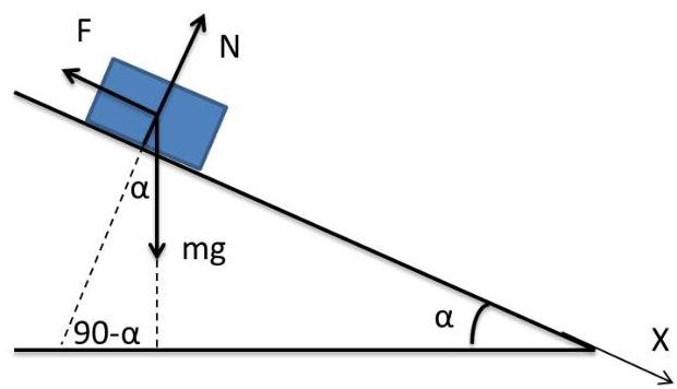 An object with a mass of is kept motionless on an inclined plane by a force parallel to the plane. The angle of the incline is ; the object is at a vertical height of above the bottom; friction is negligible. What is the value of the force in Newtons?