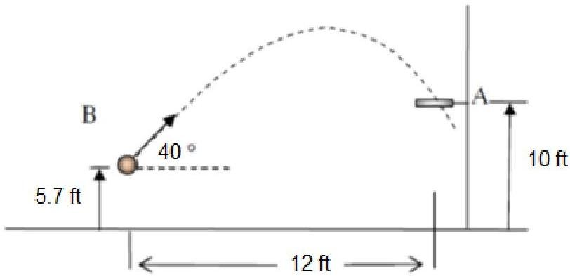 A player is about to drive into the rim but at a distance of 10ft a defender came his way. So he decided to take a fade away jump shot having a jumping velocity of 11ft/s at 50degrees to the horizontal. He will be releasing the ball at the highest point of his jump; he also leaned back at an angle of 40degrees to the vertical to further himself from the defender. If the player's shooting height is 6ft and takes his shot at 40degrees to the horizontal, how much initial velocity must he exert unto the ball if the hoop is 10ft high from the floor?