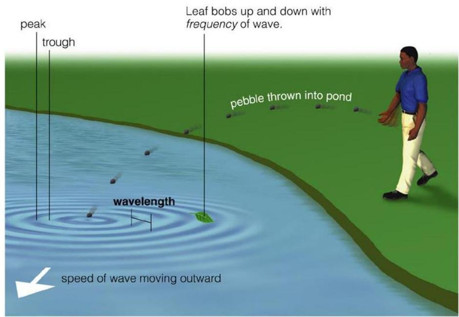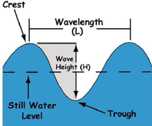 Wavelength is the horizontal distance, either between the crests or troughs of two consecutive waves.